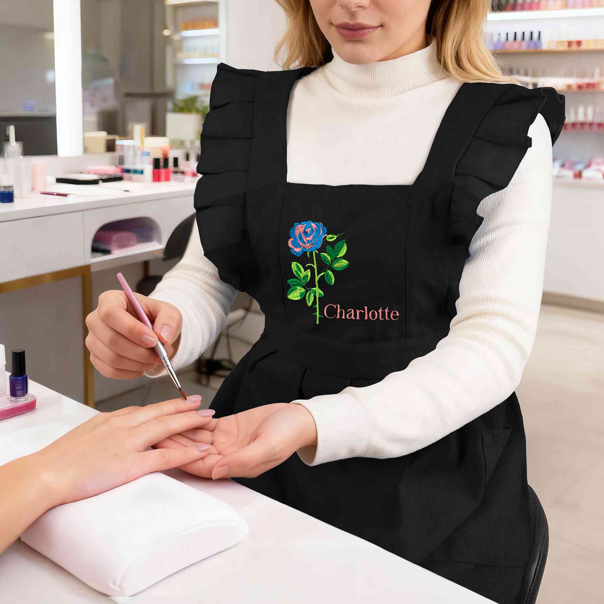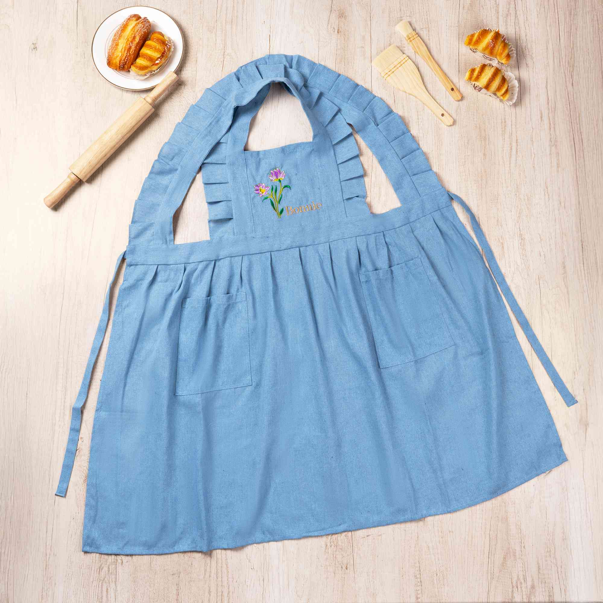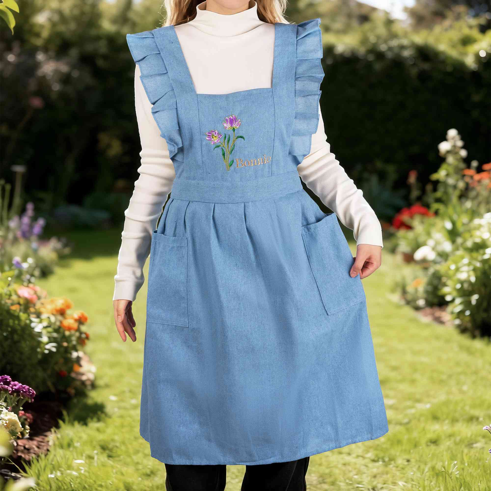 Charming Ruffled Design - This apron showcases a soft ruffle trim paired with an embroidered birth flower motif, giving it a graceful, feminine style. Its flattering shape and handy pockets blend beauty with function, making it great for cooking, gardening, or creative projects.
